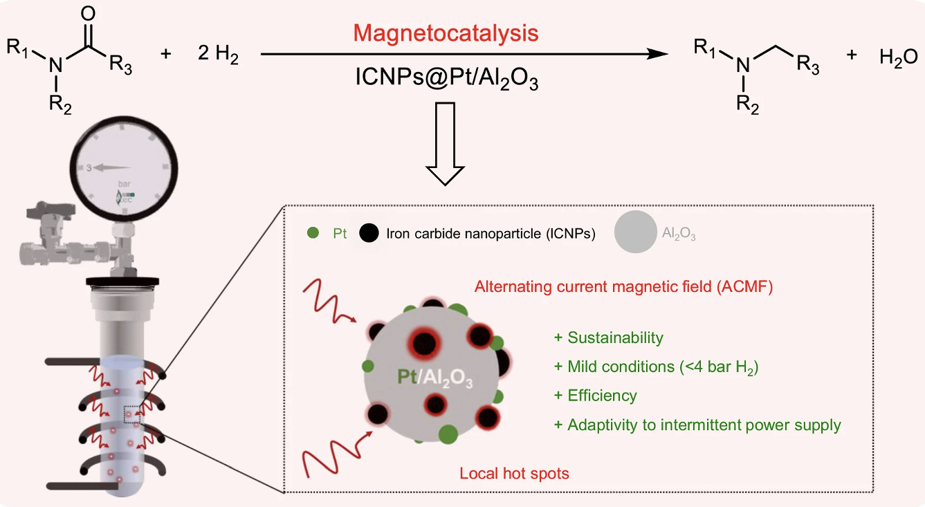 This invention presents a novel magnetocatalytic process for the hydrogenation of amides into amines using molecular hydrogen under low-pressure conditions. The method utilizes a commercially available platinum-on-alumina (Pt/Al₂O₃) catalyst functionalized with magnetic iron carbide nanoparticles (ICNPs). When exposed to an alternating current magnetic field (ACMF), these ICNPs generate localized heating, transferring energy efficiently to neighboring platinum sites and enabling catalytic ...
