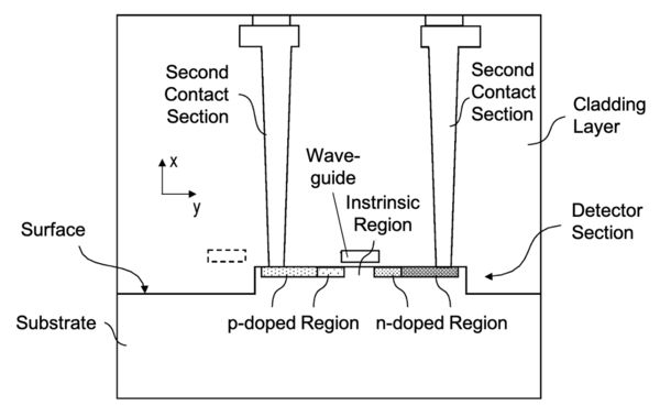Figure 1: Cross-section of the photodetector showing the waveguide above a p-i-n junction detector. Light is coupled evanescently from the waveguide into the detector, enabling efficient charge generation and signal extraction via the contact sections.