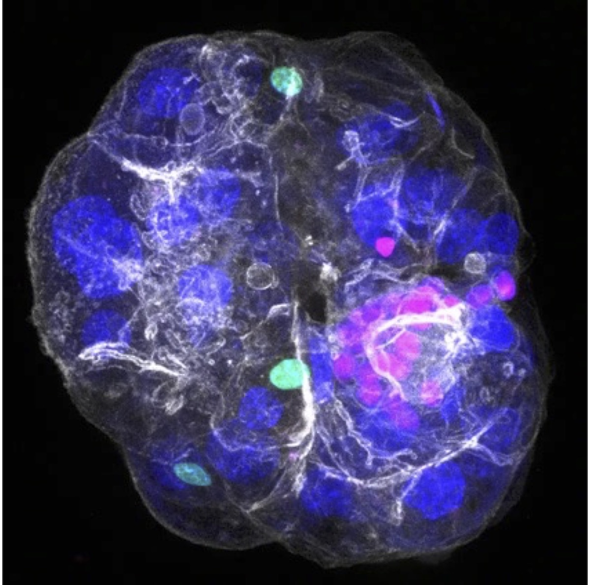 Figure 1 Mouse liver periportal assembloid, with the three component cell types visualized: cholangiocytes in pink, portal fibroblasts in green, and hepatocyte nuclei in blue; all cell borders are visualized in white.