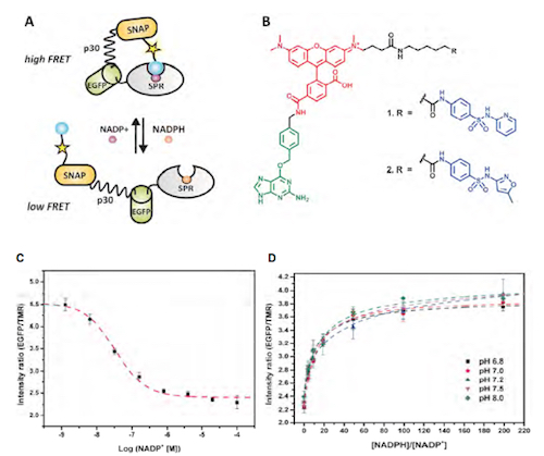 (A) Schematic description of the structure and sensing mechanism of a NADP-specific FRET sensor based on the human sepiapterin reductase as binding protein. (B) Chemical structure of the synthetic molecule BG-TMR-C6-SPY (1) and BG-TMR-C6-SMX (2) (SPY: sulfapyridine; SMX: sulfamethoxazole) used for the 20 SNAP-tag labelling. The O6-benzylguanine moiety for the SNAP-tag, the tetramethylrhodamine fluorophore and SPR ligands are depicted in green, red and blue, respectively. (C) Response curve of the sensor (SNAP-p30-EGFP-SPR labelled with BG-TMR-C6-SMX) titrated with NADP+. The FRET ratio change of this sensor is 1.8-fold between its closed and open state (improved to 8-fold in later versions). (D) Response curves of the sensor (SNAP-p30-EGFP-SPR labelled with BG-TMR-C6-SMX) titrated with ratios of NADPH/NADP+. Using sulfamethoxazole as intramolecular ligand produces a sensor insensitive to pH changes.
