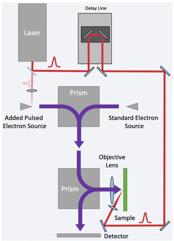 Figure 1: Schematic of the ULEEM setup. A femtosecond laser pulse is split and delayed via a delay line before illuminating a photocathode to generate pulsed electron bunches. These electrons are injected into a low-energy electron microscope via an added pulsed electron source. Prisms and electron optics guide the beam toward the sample. Reflected or emitted electrons are detected to reconstruct ultrafast changes in the sample surface structure.